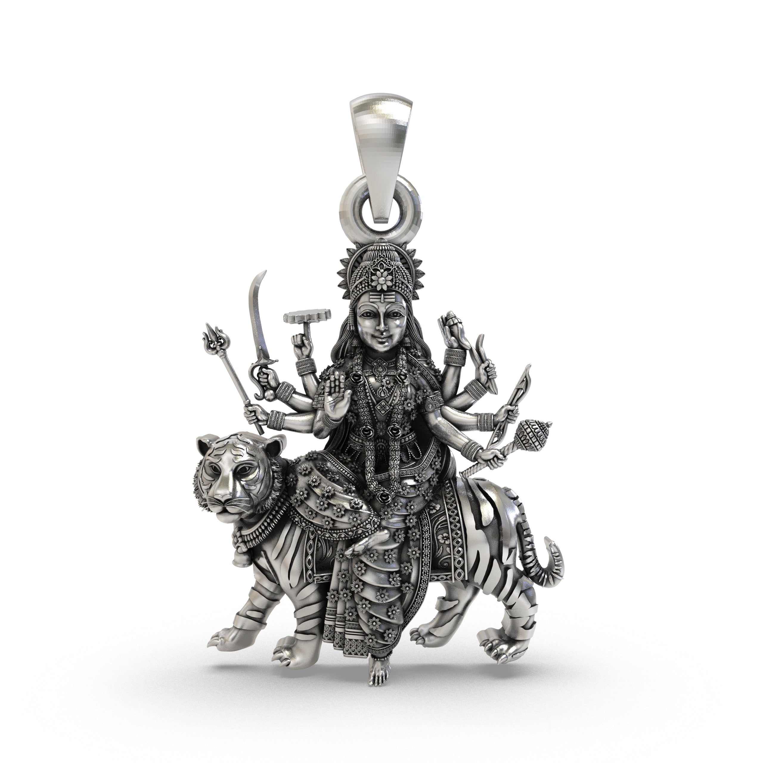 925 Silver Durga Maa Pendant – Tiger Vahana (Simhavahini), Multi-Armed Shakti with Trishul, Antique-Oxidized Handcrafted Temple Jewelry, Navratri Gift