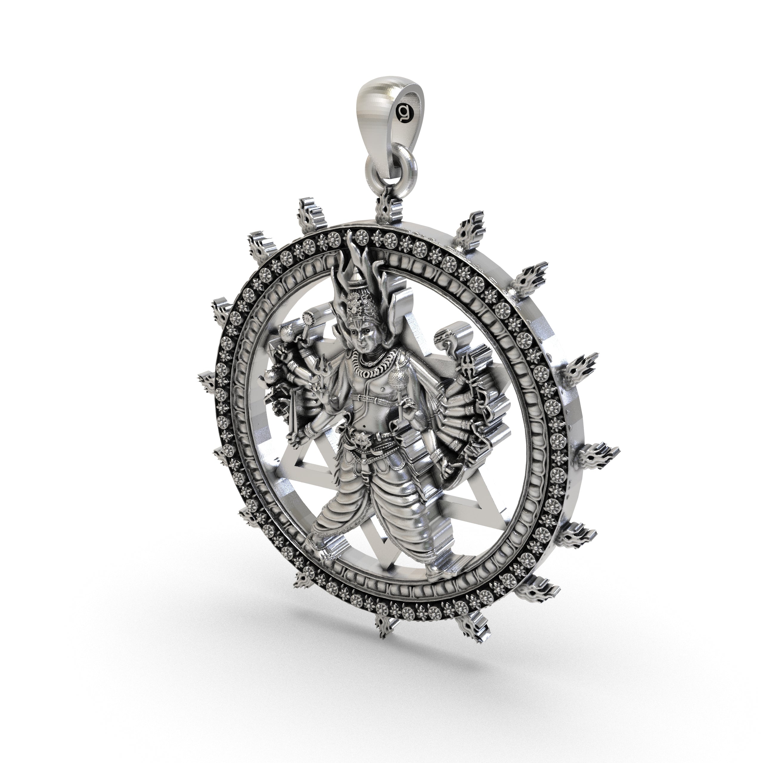This masterpiece blends the sacred Sudarshan Chakra the ultimate symbol of protection, righteousness, and cosmic orderwith intricate silver detailing for an extraordinary spiritual talisman.