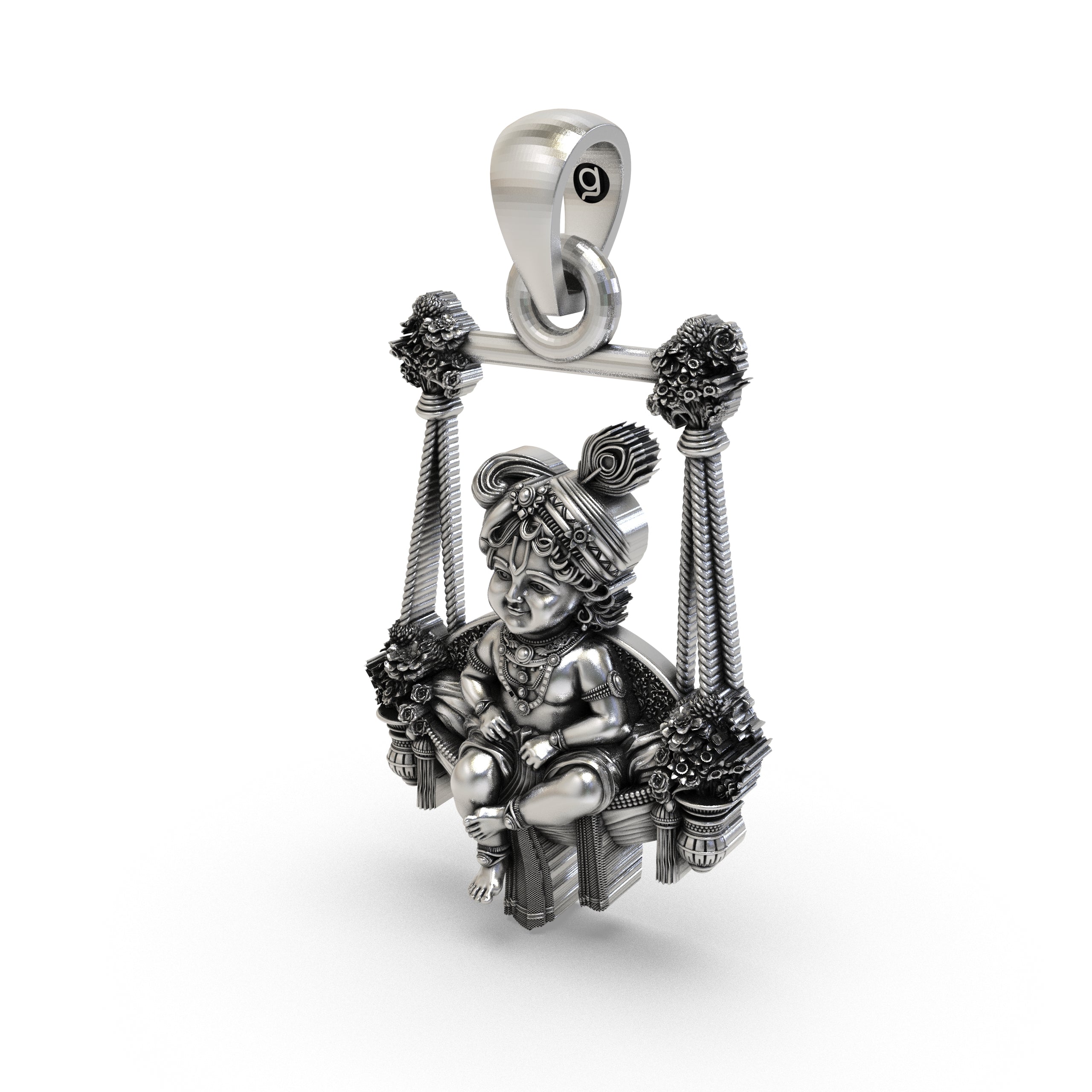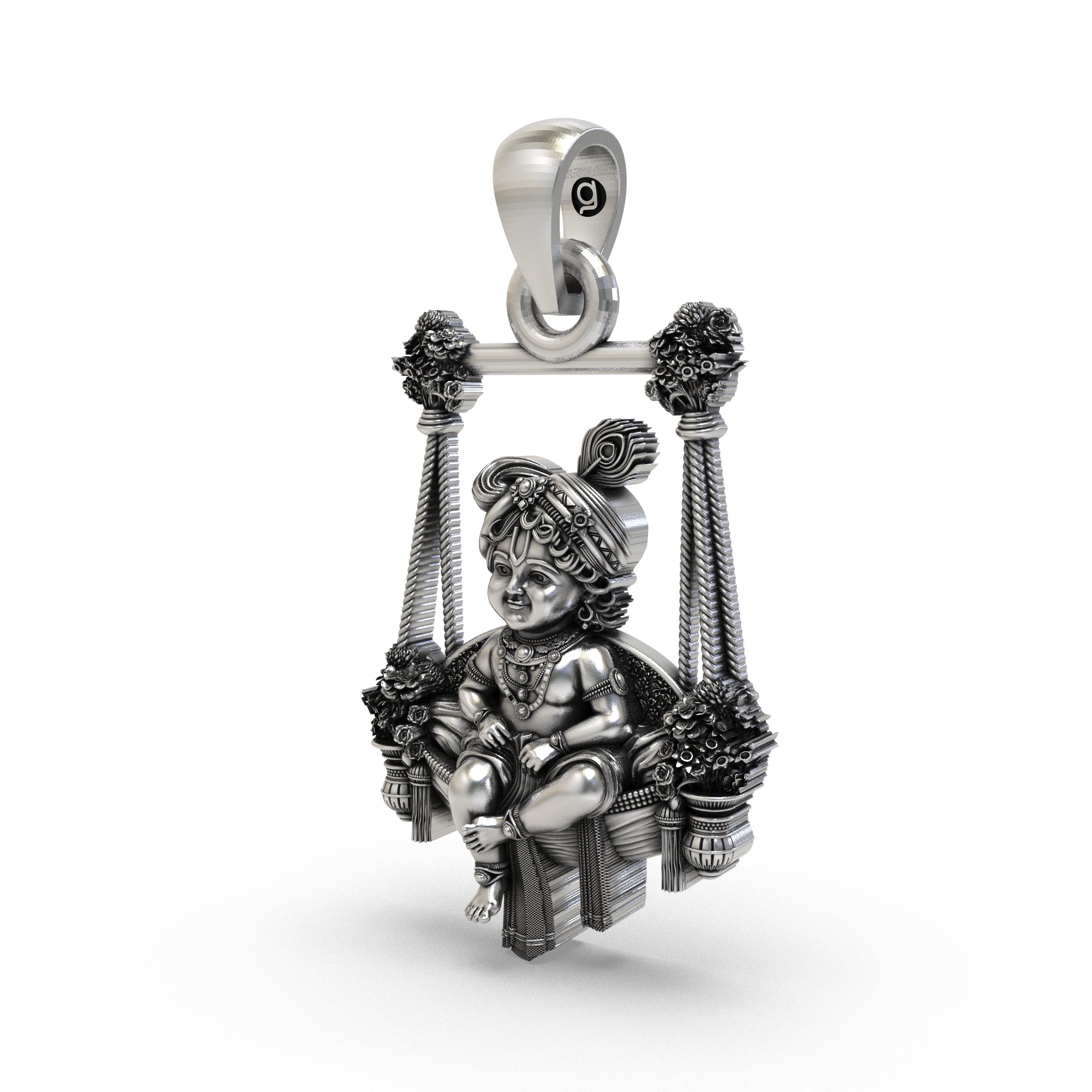 Sterling Silver Bal Gopal Swing Pendant – Baby Krishna on Jhula with Mor-Mukut, Handcrafted Antique Devotional Piece